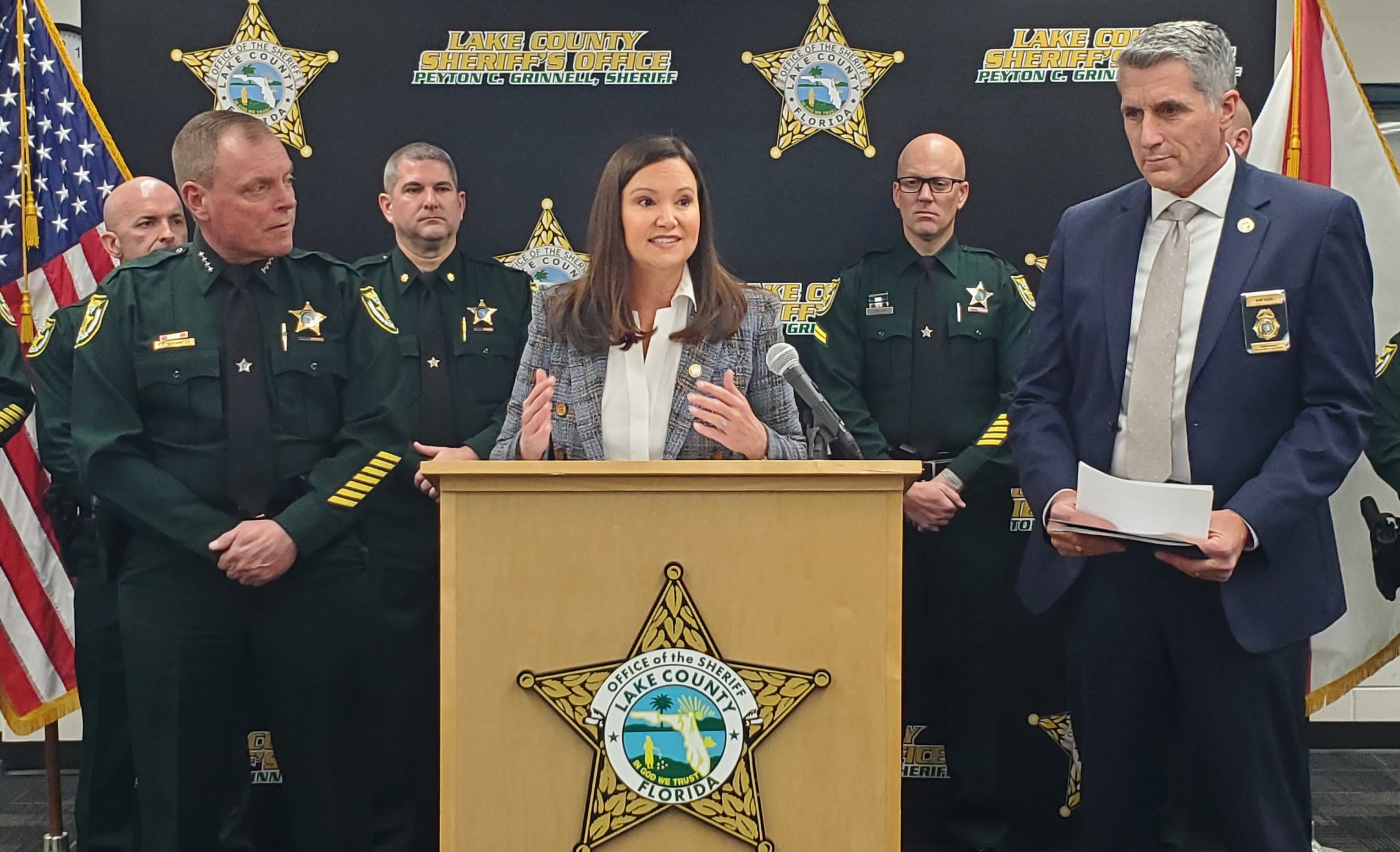 Attorney General Moody detailing results from the Florida Medical Examiners Drugs Identified in Deceased Persons Report, alongside Lake County Sheriff Peyton Grinnell and Florida Department of Law Enforcement Commissioner Mark Glass.