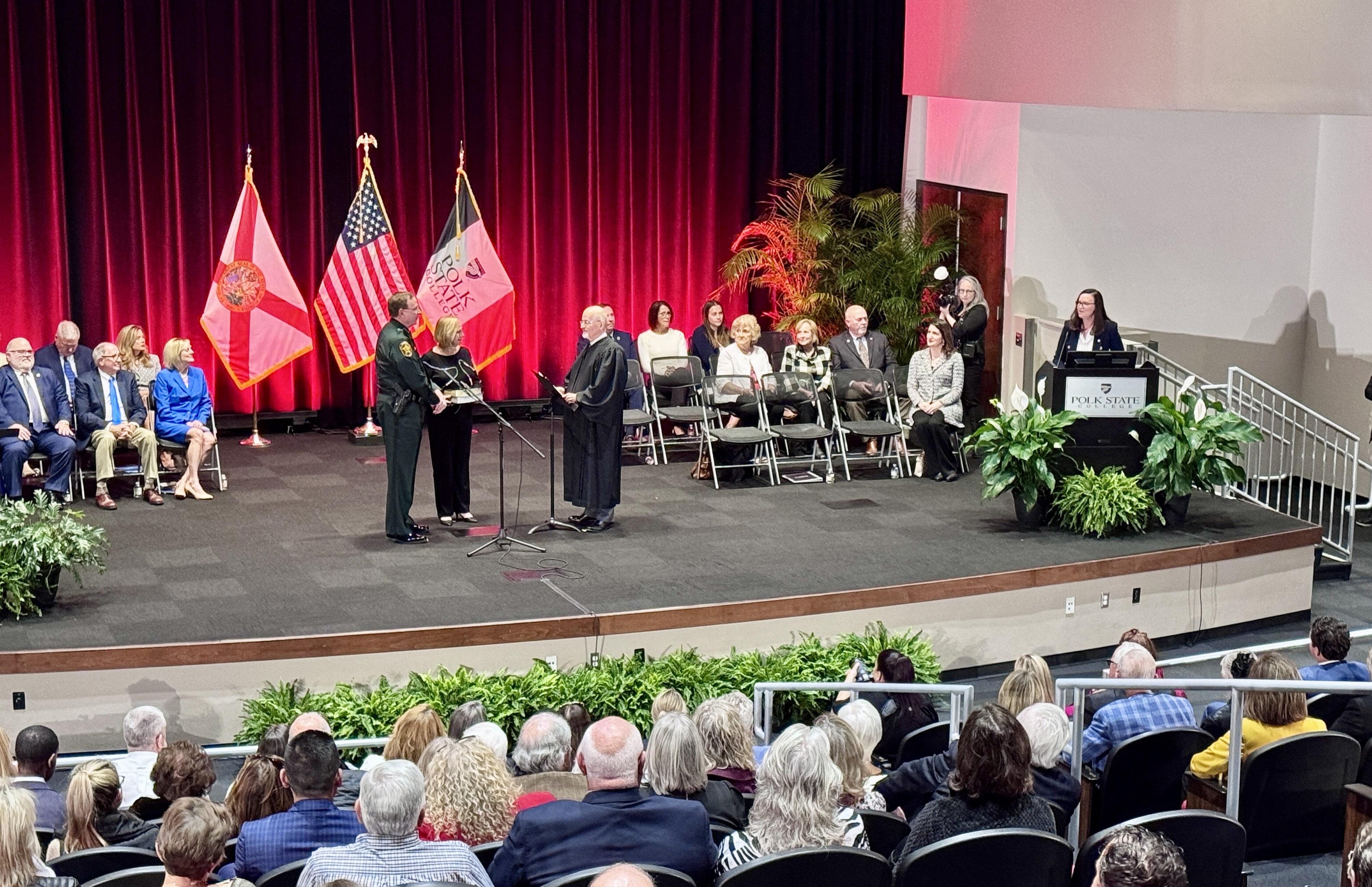 Attorney General Moody emceeing the swearing in of Polk County constitutional officers, including Polk County Sheriff Grady Judd, at the Polk State College Center for Public Safety Administration in Winter Haven.
