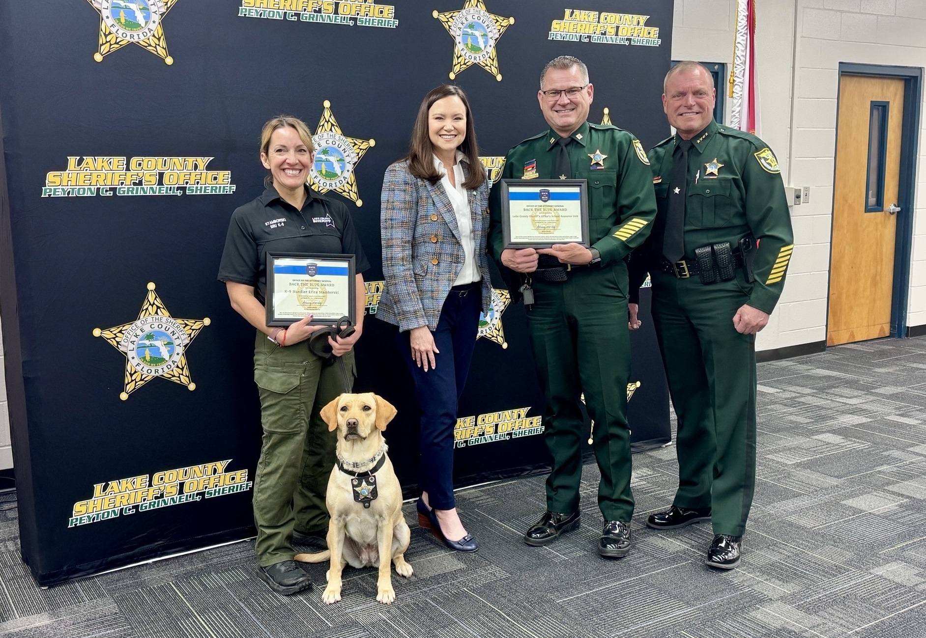 Attorney General Moody presenting a Back the Blue Award to the Lake County Sheriff’s Office School Resource Unit, along with LCSO Deputy Erica Stamborski and her K-9 companion Samba, the nation’s first vape-detecting K-9.