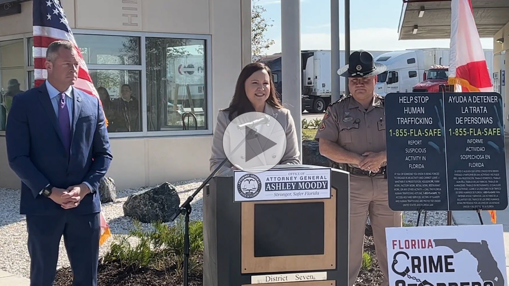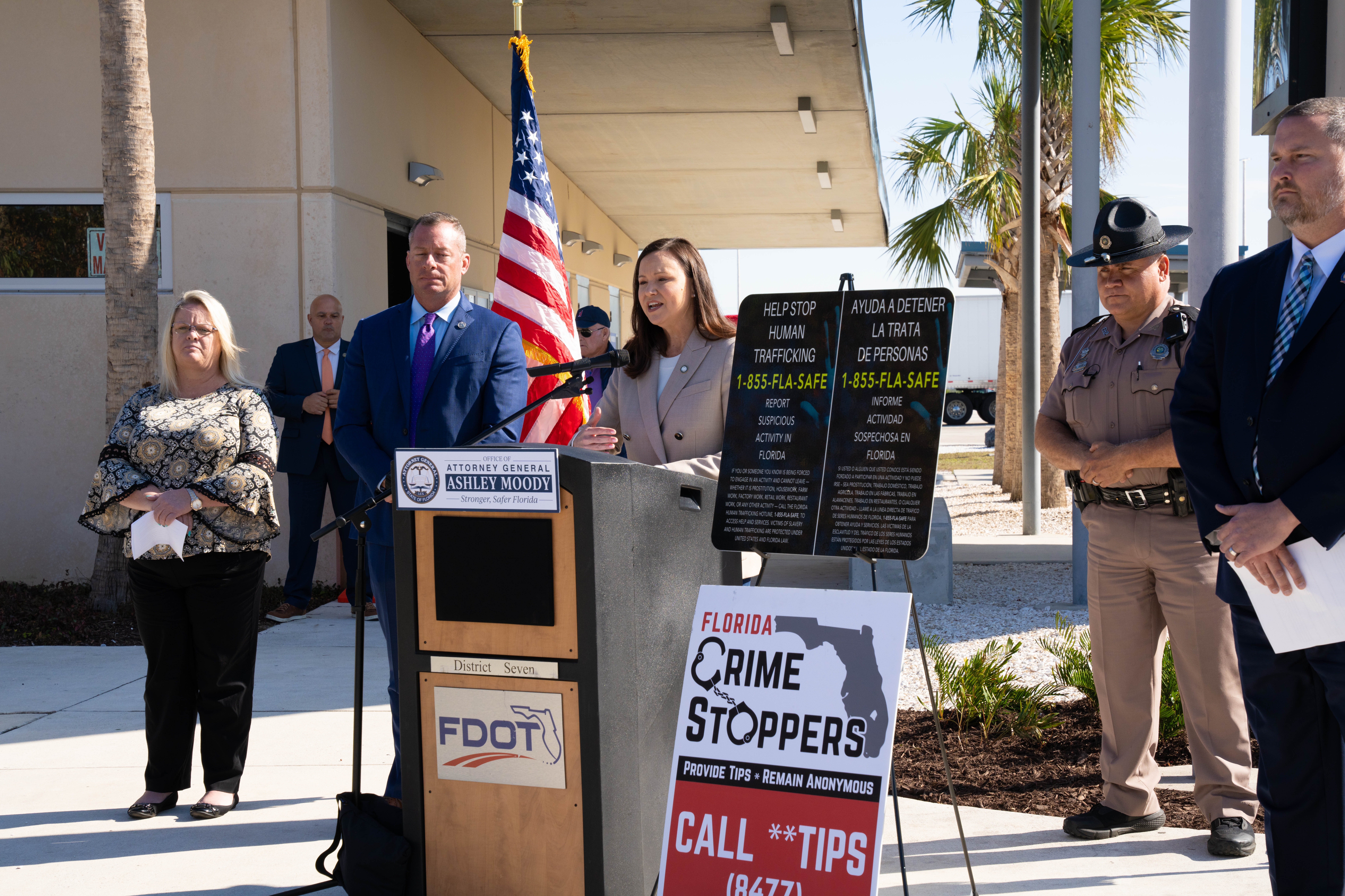 Attorney General Moody announced new signage being installed at rest stops across Florida highlighting the state’s new anti-trafficking hotline. Attorney General Moody also announced an increase in reward money for Crime Stoppers tips that lead to the rescue of a victim or the arrest of a trafficker.
