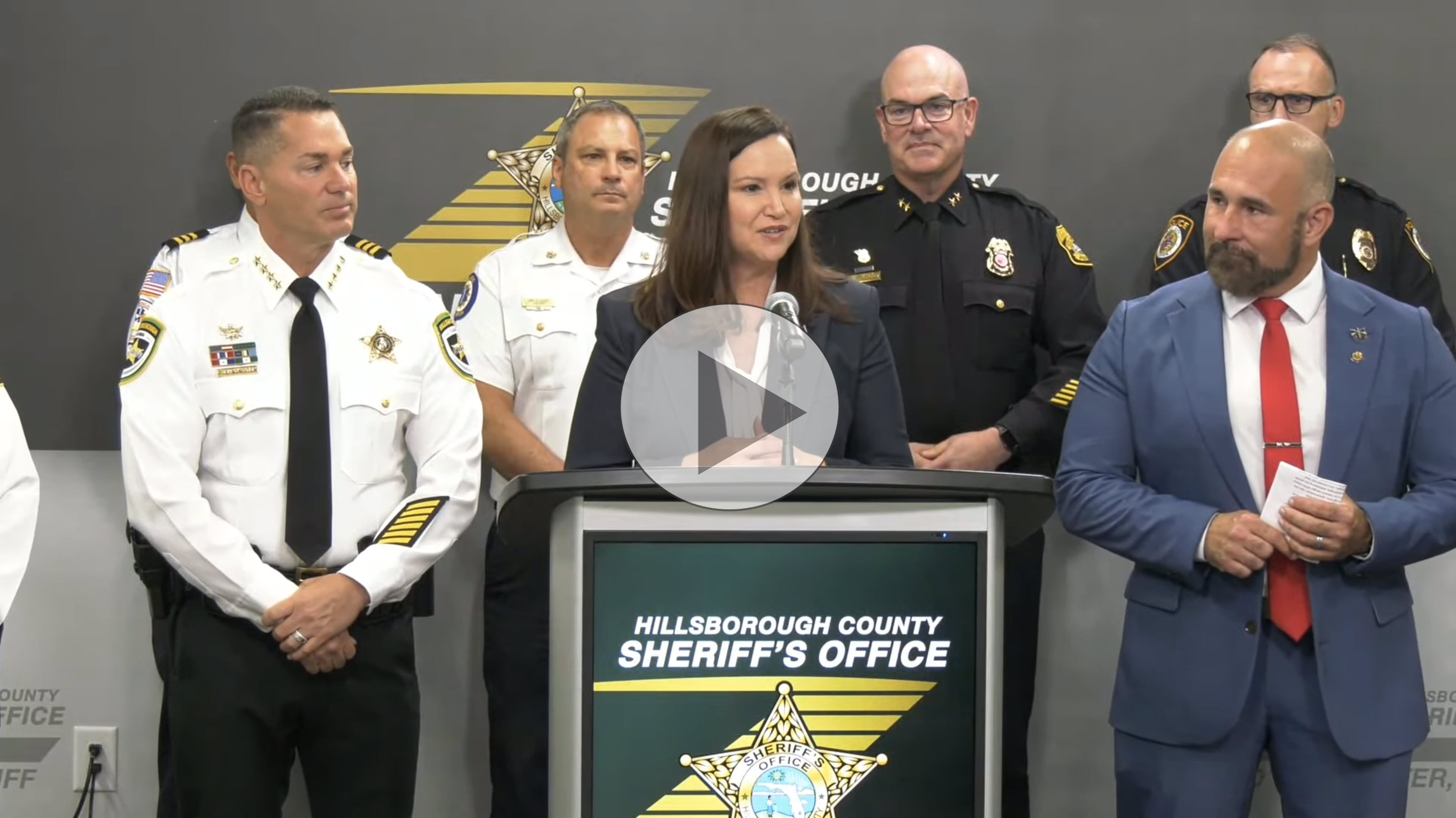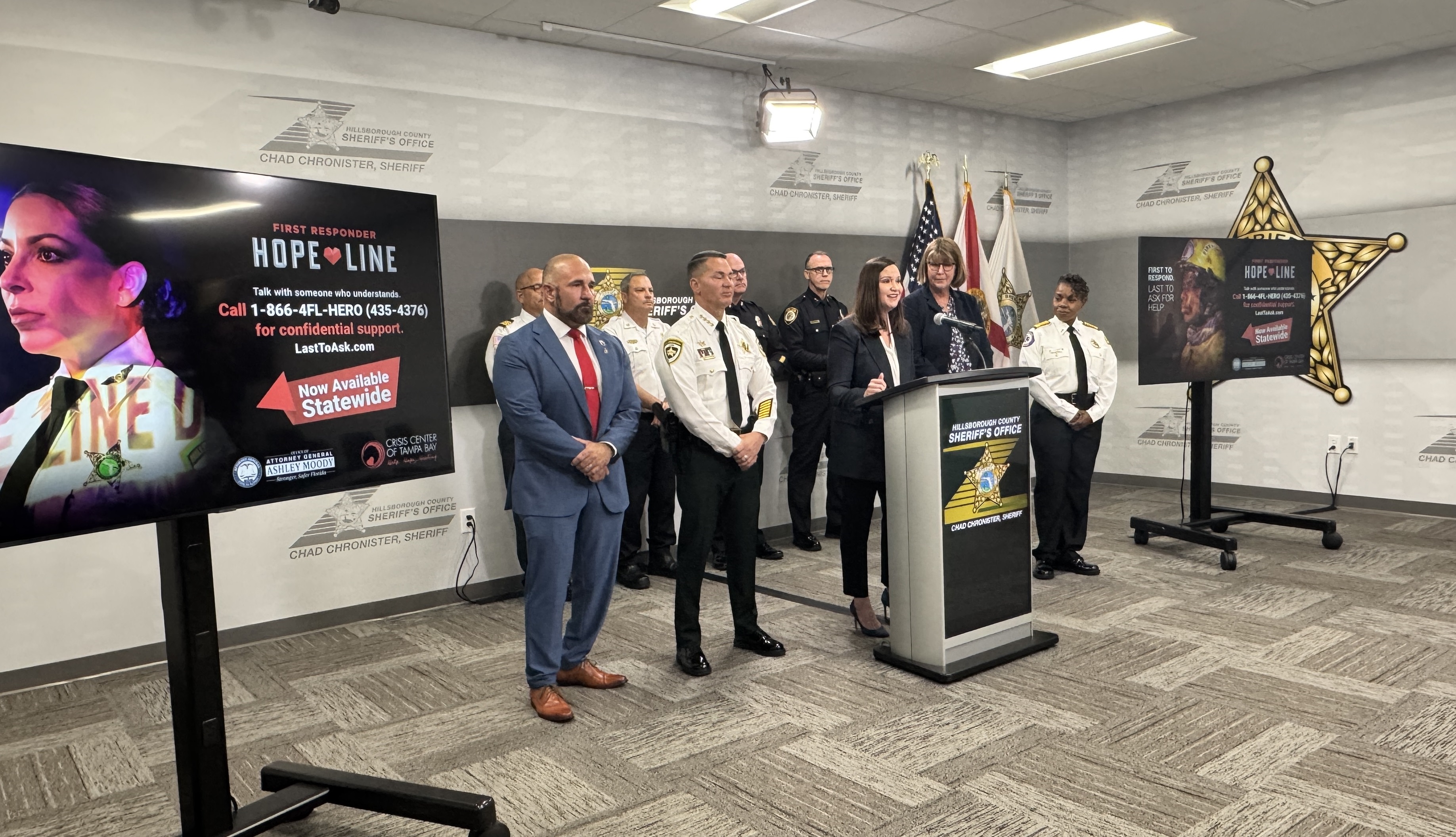 Attorney General Moody with Hillsborough County Sheriff Chad Chronister, state Senator Jay Collins and Crisis Center of Tampa Bay President & CEO Clara Reynolds at the Hillsborough County Sheriff’s Office announcing the expansion of the First Responder Hope Line statewide.